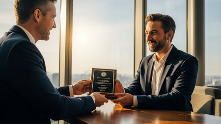 Professional men in suits exchange wooden plaque award recognition achievement success high-rise office window sunset light corporate life