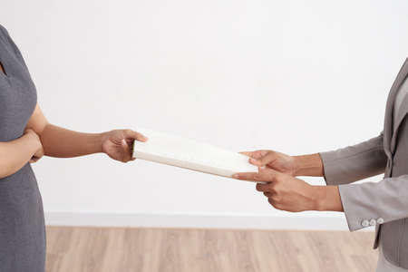 Cropped image of female entrepreneur giving planner to her employee