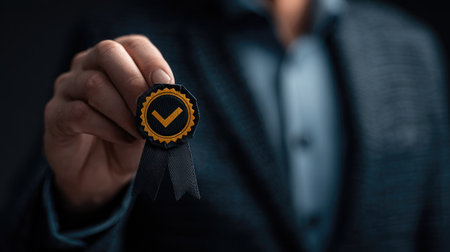 Person is holding a small, round, quality assurance award with a black ribbon. The award features a gold checkmark symbol. The person wearing a dark suit is seen from the mid-section up.