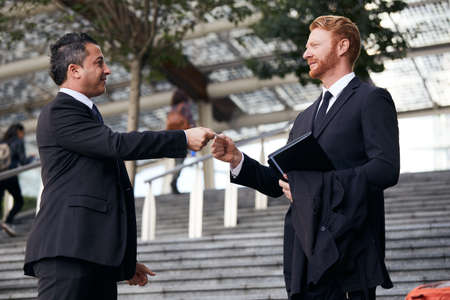 Businessman shaking hands with colleague greeting him with successful opening of new business. Modern office settings.