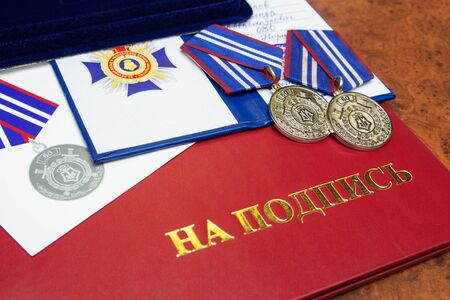 Moscow, Russia -March 27, 2019: Two medals of the Russian National Guard lie on the table. Russian text for signature