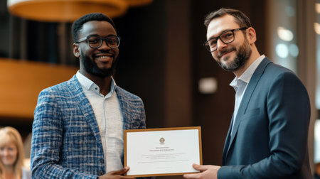 Two individuals express joy and pride while engaging in a formal ceremony