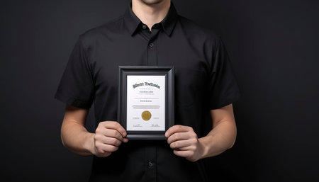 A blank diploma or a mockup certificate in the hand of a man employee wearing shirt on black background