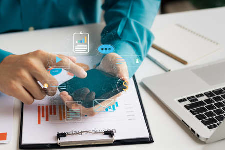 Businessman using smartphone, analyze business statistics with graphs and diagrams. Success and startup concept.