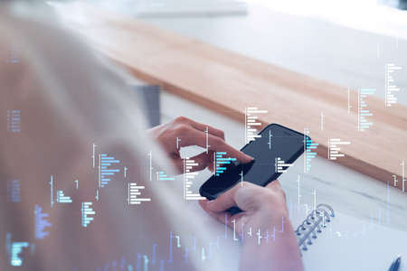 Trader holding in the hands a smart phone and researching stock market to proceed right investment solutions. Internet trading and wealth management concept. Hologram Forex chart over close up shot.