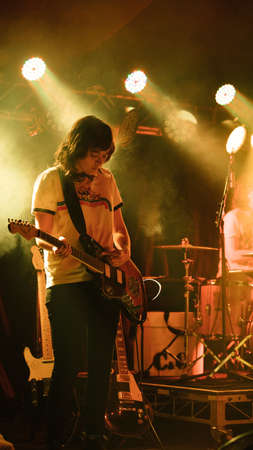 Stage lights.Playing guitar and concert concept.Live music background.Rock concert.Music festival.Instrument on stage and band,bass guitarist.