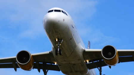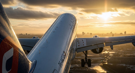 Stunning image of a commercial airplane flying high in the sky, showcasing the beauty of aviation and the thrill of travel with a captivating perspective and vibrant lighting.