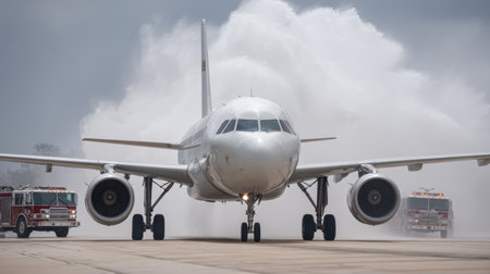 An impressive water salute ceremony welcomes an aircraft as it completes a safe landing, with fire trucks spraying water in celebration, highlighting teamwork and safety.