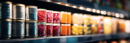 Close-up of various canned food jars neatly arranged on a wooden shelf, creating a cozy and inviting atmosphere in a market setting.