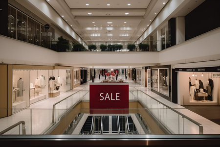 Shopping mall building blurred background. People shopping in modern commercial mall center. Interior of retail center store in soft focus. Luxury inside business hall