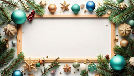 Festive Christmas frame surrounded by colorful ornaments, pine branches, and holiday decorations, perfect for seasonal greetings, festive promotions, or holiday-themed marketing content