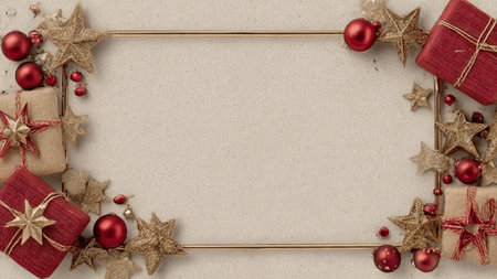 Golden stars and red ornaments arranged around classic holiday gift boxes in a warm frame.