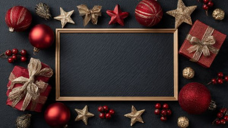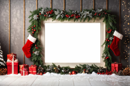 This image features a blank frame surrounded by Christmas decorations, red baubles, candy canes, gifts, and pine branches, offering a festive and joyful holiday theme perfect for seasonal greetings. AI generated image