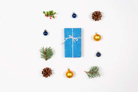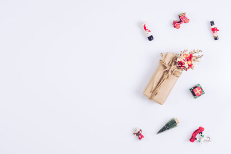 Handmade Christmas gift box with toys decoration on white background with copy space for your text. Flat lay Top view.