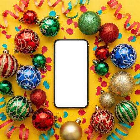 Mobile phone with blank screen and colorful Christmas ornaments on yellow background