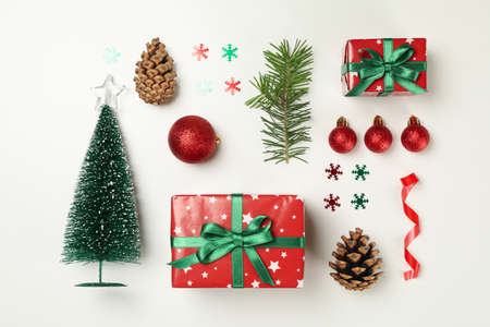 Flat lay with Christmas accessories on white background