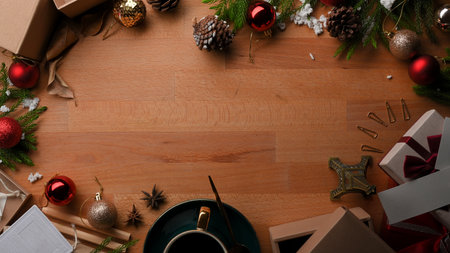 Top view of wooden table with copy space, present box and decorations in Christmas concept
