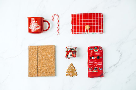 Sustainable christmas Gifts, Eco-Friendly Holiday Xmas Gift Ideas. Red and brown zero waste cup, shopper bag, socks, notepad, sweets, cookies on table
