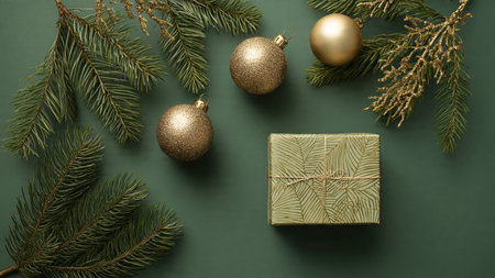 Christmas flat lay background with neatly arranged presents, fir branches, and sparkling baubles, offering a clean and festive canvas for designs or messages