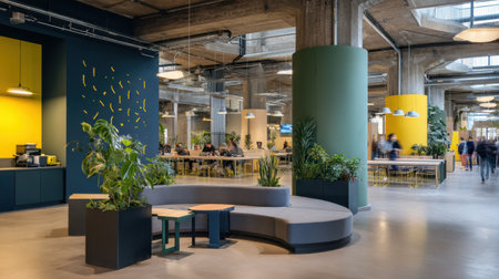 Modern eco friendly office interior design showing sustainable elements and innovative aesthetics