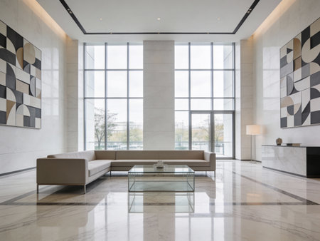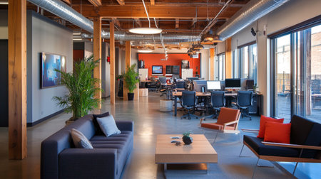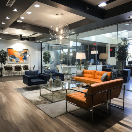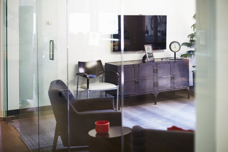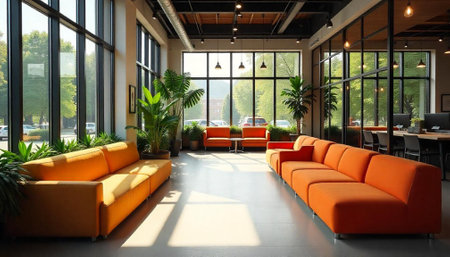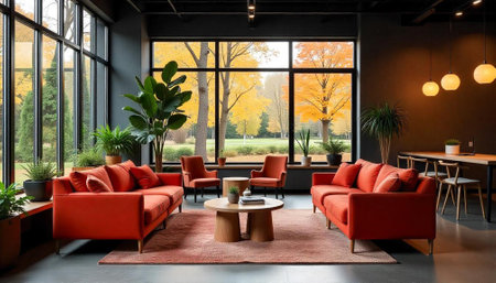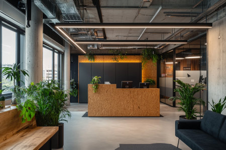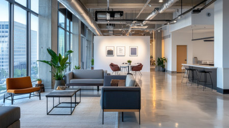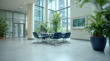 cozy waiting lounge with large windows, soft and comfortable armchairs, green and natural plants in modern coworking environment, workspace organization concept