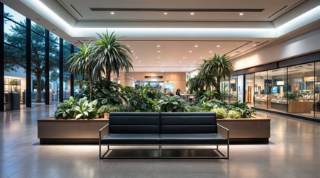 Front view of one wide black bench inside a light Shopping Mall with a day light and some vegetation parts without people
