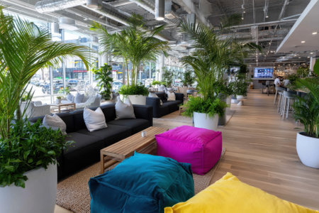 Lively lounge area featuring colorful seating and tropical plants, bustling with visitors enjoying their time.