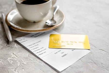 restaurant bill paying by credit card for coffee on stone table background