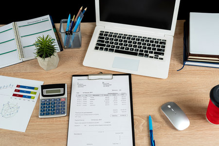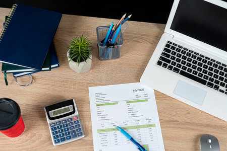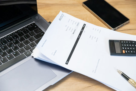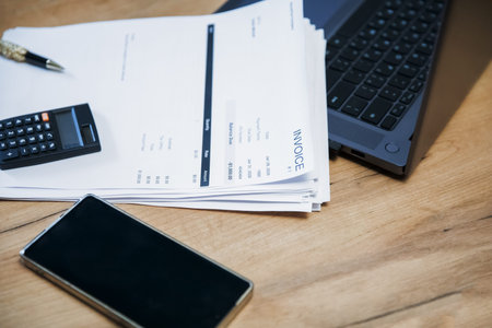 Stack of invoice documents on a wooden desk with a calculator, a pen, a phone, and a laptop. Business accounting concept for financial management.