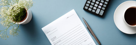 This image features essential tools for business tasks, including financial documents, a calculator, and notebooks arranged neatly on a blue surface, ideal for productivity.
