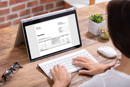 Close-up Of A Businesswoman Filling The Invoice Form On Laptop Over The Wooden Desk