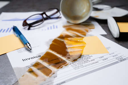 Close-up Of Coffee Spilling Out From Cup Over Graph And Invoice On Office Desk