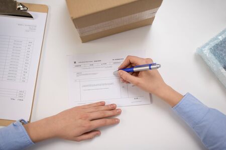 close up of woman filling postal form at office
