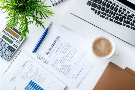 Workspace with laptop, coffee, and documents on a desk during a busy workday in the office