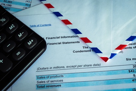 Financial statement letter on envelope and eyeglass, business concept, document is mock-up