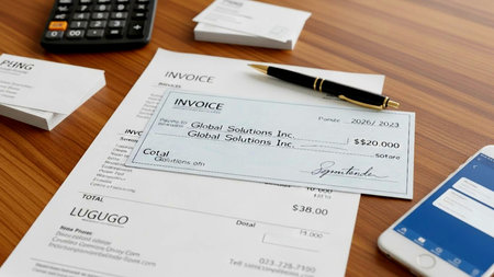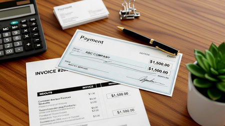 An image of a desk with payment documentation, including an invoice and a check.