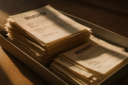 Close-up of a stack of invoices and receipts being neatly organized in a tray.