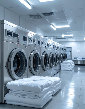 A commercial laundromat with multiple industrial washing machines in a clean, modern setting. Business, cleaning service, or self-service laundry facility promotions.