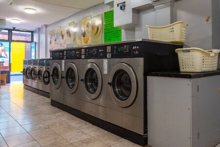London, UK - May 19 2018: Row of coin laundries and cloth dryers in a self-service launderette