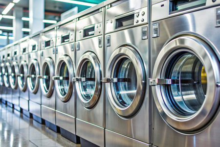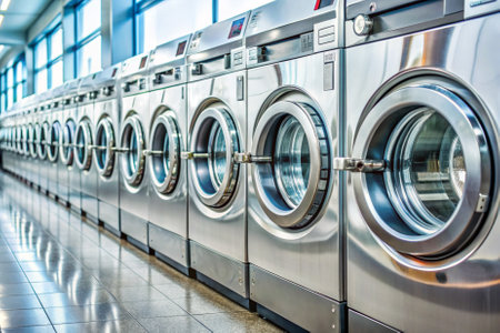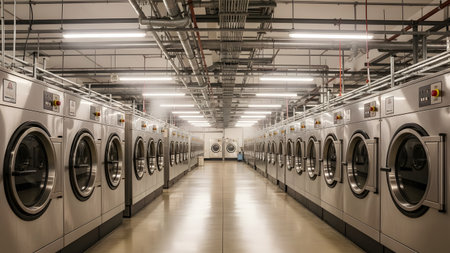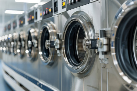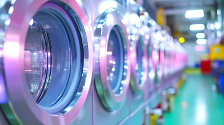 Modern Row of Industrial Washing Machines in Vibrant Laundry Facility.