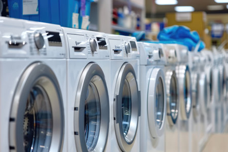 A lineup of modern washing machines on display at an appliance store, likely to be used in content about home appliances, shopping for household items, or consumer electronics