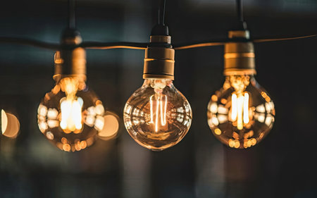 A detailed shot of multiple hanging light bulbs with a warm, glowing filament, set against a bokeh background.