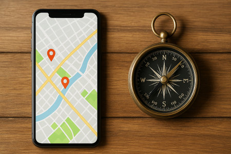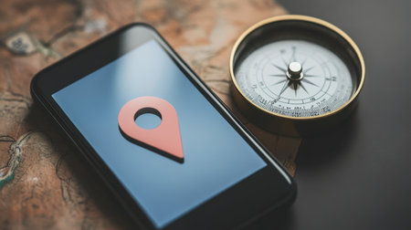 A vibrant mobile navigation tool featuring a location pin displayed on a smartphone screen, paired with a traditional compass, ideal for travel enthusiasts.
