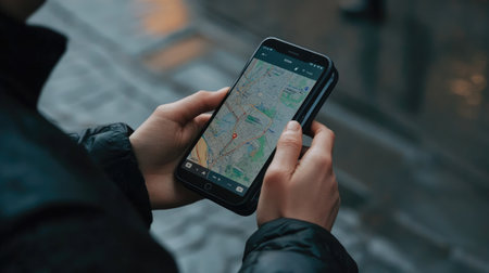 A close-up view of a person navigating using a smartphone map in an urban environment. The image captures technology's role in modern exploration and travel.