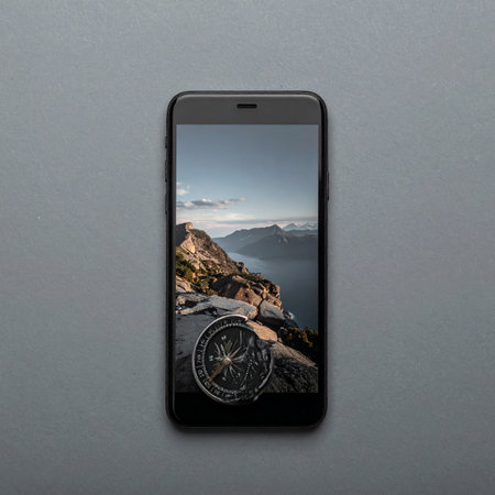 Planning the next great adventure. A smartphone displays a stunning mountain landscape with a compass app, symbolizing the journey ahead.
