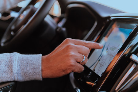 Close-up Of Man Hand Using GPS Navigation Inside Car