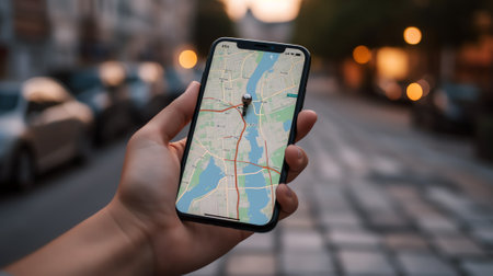 Hands holding a smartphone displaying a navigation app with a map of a city street at dusk, providing location and guidance for exploring urban environments