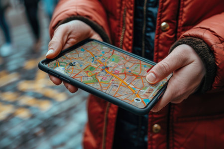 Tourist using a mobile phone with a map application, navigating through the bustling streets of a vibrant city while enjoying an exciting urban journey filled with discovery