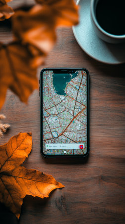 Smartphone displaying an online map lies on a wooden table alongside a cup of coffee and autumn leaves, creating a cozy autumnal scene perfect for travel planning or exploring new destinations