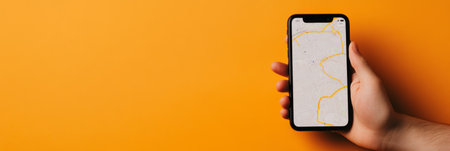 Close up of a hand holding a smartphone with a gps navigation app displaying a highlighted route against a vibrant orange background, offering ample copy space
